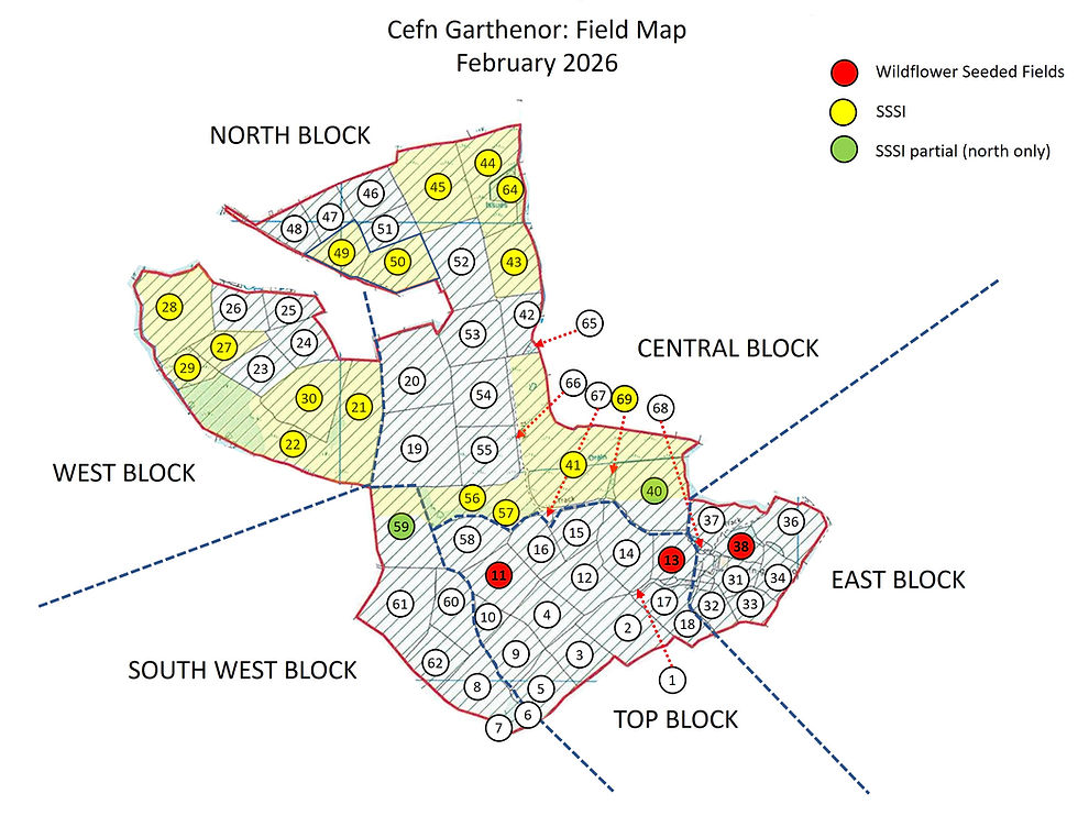 The seed was sourced partly from the Welsh botanic gardens and partly from our own crop of yellow rattle, which we had previously harvested using our own wildflower seed harvester from the very first field (field 13) we had scattered seed on back in December 2021. That was mainly yellow rattle, again originally from the Welsh botanic gardens, which as been a great success. Not only do the wildflowers look beautiful, but of course they attract insects, which feed the birds, etc, etc. All good stuff.